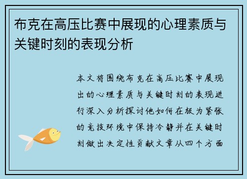 本文将围绕布克在高压比赛中展现出的心理素质与关键时刻的表现进行深入分析,探讨他如何在极为紧张的竞技环境中,保持冷静,并在关键时刻做出决定性贡献。文章从四个方面进行阐述:一是布克在高压比赛中的心理调节能力,二是布克在关键时刻的决策能力,三是布克的自信心与比赛中的表现,四是布克如何利用球队支持提升自我表现。每个方面将分别分析布克在关键比赛中的具体表现及其背后的心理机制,帮助我们全面理解布克如何成为一名出色的高压比赛球员。最后,文章将总结布克的成功因素,揭示他的心理素质为何能够在激烈的比赛中脱颖而出,成为一名关键时刻的绝对核心。